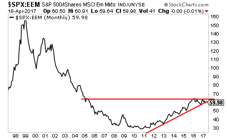 Below is a chart of the S&P 500 priced in Emerging Market Stocks.