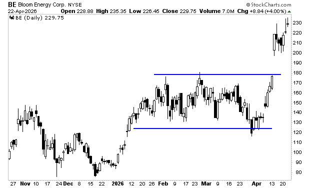 Bloom Energy (BE) builds solid oxide fuel cells (SOFCs) — essentially small, modular power plants that generate electricity on-site. As such it’s becoming a major player for AI energy needs. The stock has gone vertical.